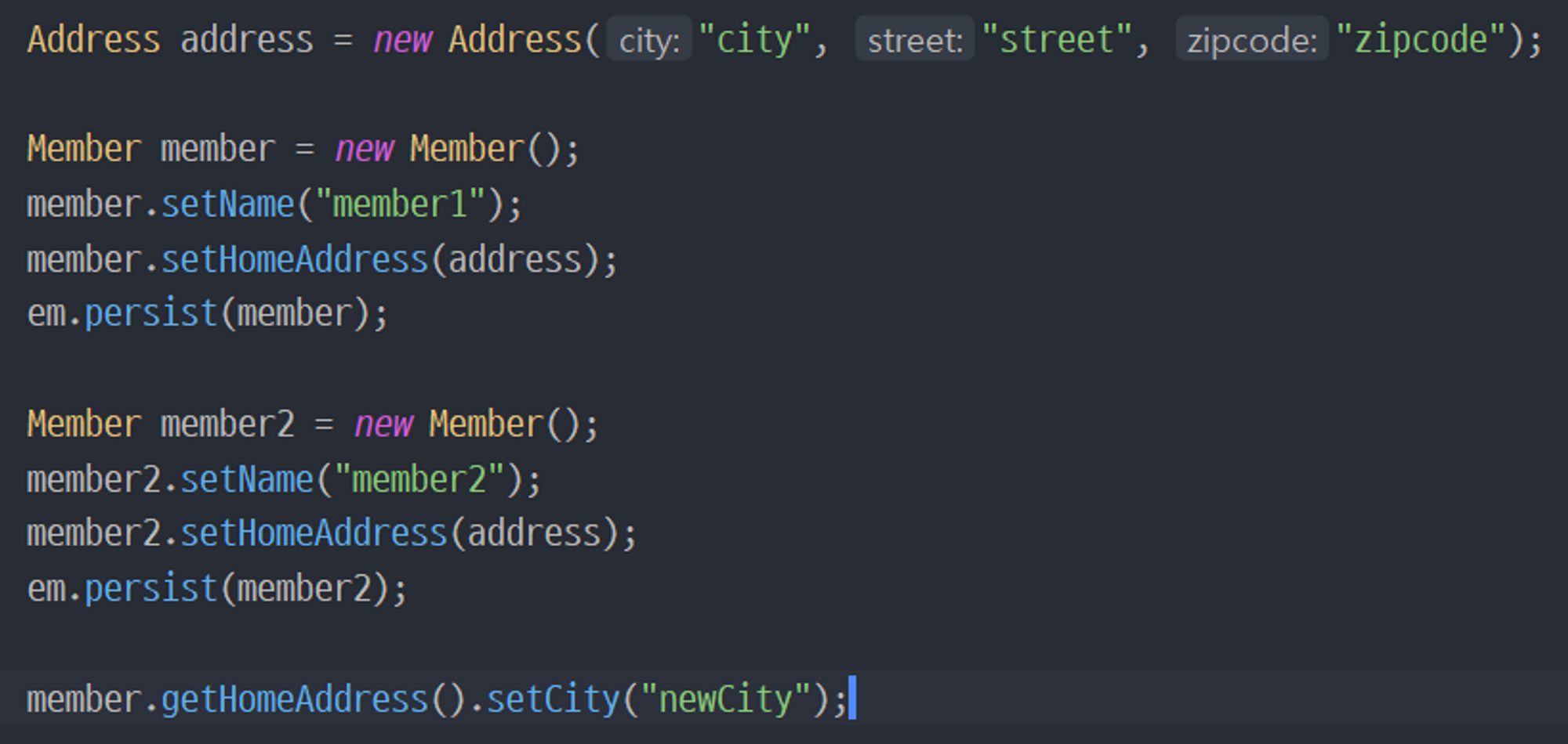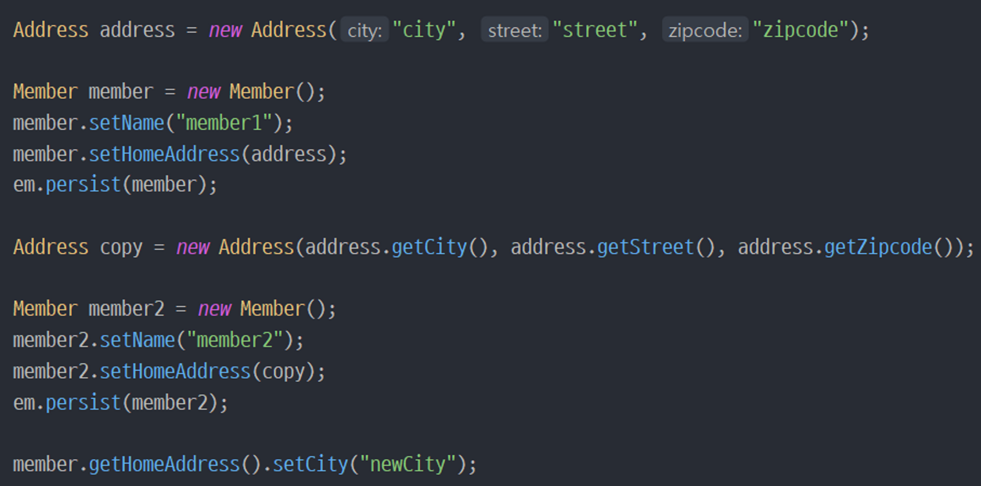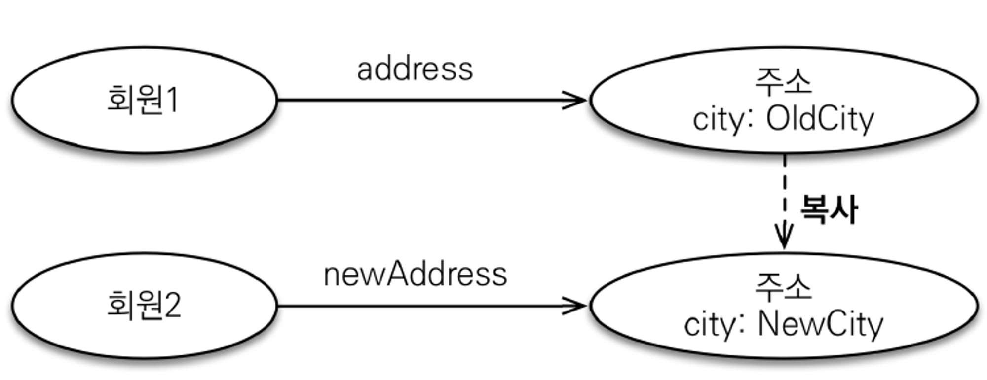 위 테스트를 보면 member와 member2가 공유하는 address를 member에서만 수정했는데 member2도 수정되었다.