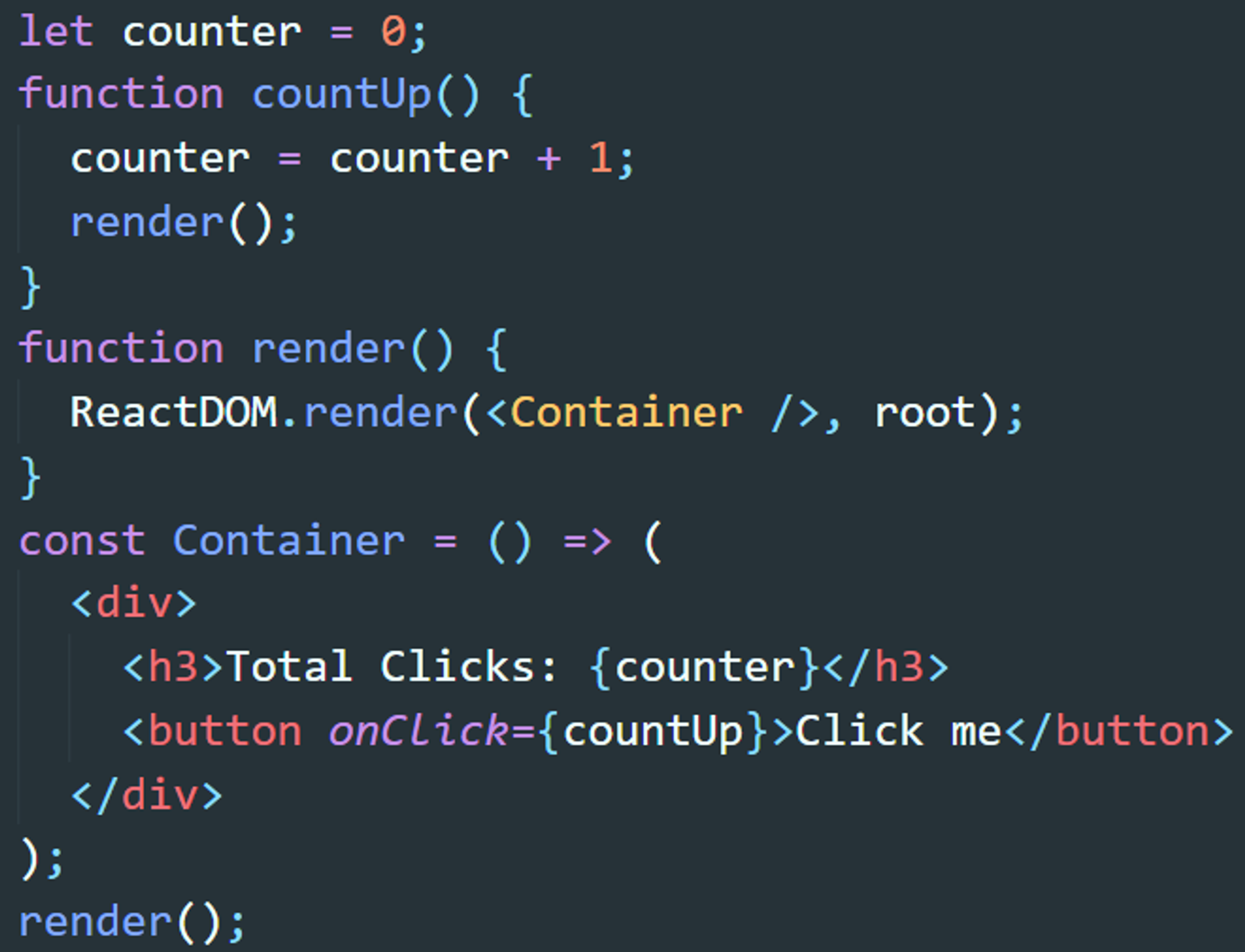 위 코드를 보면 onClick을 통해 counter 변수가 변경될 때마다 리렌더링 하고 있다.