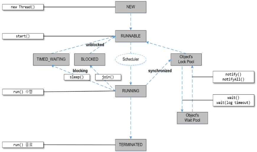 - Runnable 상태에서 Thread 스케줄러에 의해 실행 상태로 이동하게 된다.