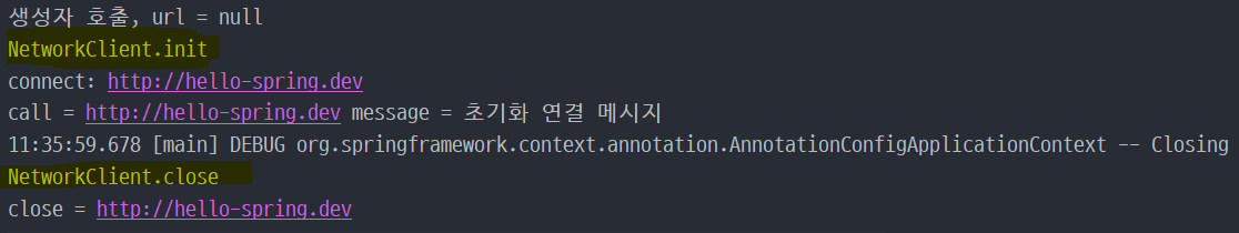 initMethod를 통해 초기화용 메서드를 지정하고, destroyMethod를 통해 종료 작업용 메서드를 지정하면 각각 콜백 시기에 작업이 수행된다.