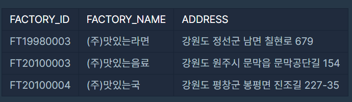 프로그래머스 SQL 풀이 - 강원도에 위치한 생산공장 목록 출력하기 본문
