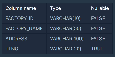 다음은 식품공장의 정보를 담은 FOOD_FACTORY 테이블입니다. FOOD_FACTORY 테이블은 다음과 같으며 FACTORY_ID, FACTORY_NAME, ADDRESS, TLNO는 각각 공장 ID, 공장 이름, 주소, 전화번호를 의미합니다.