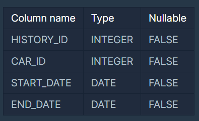 다음은 어느 자동차 대여 회사의 자동차 대여 기록 정보를 담은 CAR_RENTAL_COMPANY_RENTAL_HISTORY 테이블입니다. CAR_RENTAL_COMPANY_RENTAL_HISTORY 테이블은 아래와 같은 구조로 되어있으며, HISTORY_ID, CAR_ID, START_DATE, END_DATE 는 각각 자동차 대여 기록 ID, 자동차 ID, 대여 시작일, 대여 종료일을 나타냅니다.