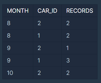 SELECT MONTH(start_date) as MONTH, CAR_ID, COUNT(*) as RECORDS