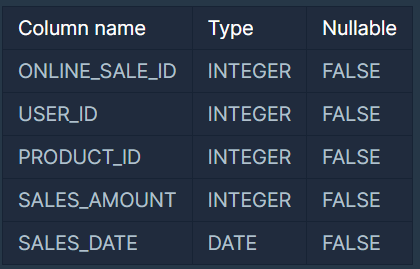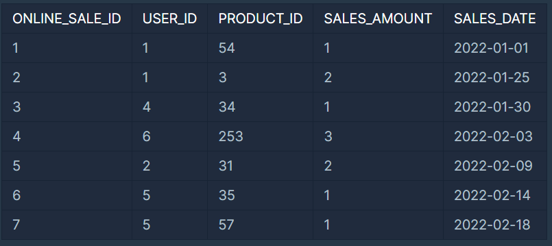 ONLINE_SALE 테이블은 아래와 같은 구조로 되어있으며, ONLINE_SALE_ID, USER_ID, PRODUCT_ID, SALES_AMOUNT, SALES_DATE는 각각 온라인 상품 판매 ID, 회원 ID, 상품 ID, 판매량, 판매일을 나타냅니다.