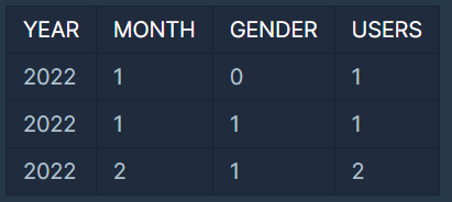 년, 월, 성별 별로 상품을 구매한 회원수를 집계하고, 년, 월, 성별을 기준으로 오름차순 정렬하면 다음과 같은 결과가 나와야 합니다.