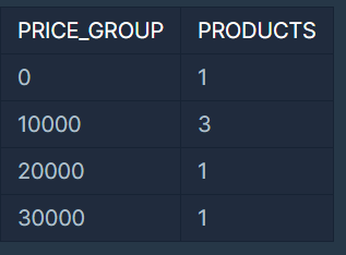 SELECT FLOOR(PRICE/10000)*10000 as PRICE_GROUP, COUNT(*) as PRODUCTS