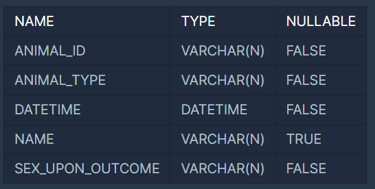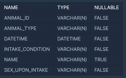 ANIMAL_INS 테이블은 동물 보호소에 들어온 동물의 정보를 담은 테이블입니다. ANIMAL_INS 테이블 구조는 다음과 같으며, ANIMAL_ID, ANIMAL_TYPE, DATETIME, INTAKE_CONDITION, NAME, SEX_UPON_INTAKE는 각각 동물의 아이디, 생물 종, 보호 시작일, 보호 시작 시 상태, 이름, 성별 및 중성화 여부를 나타냅니다.