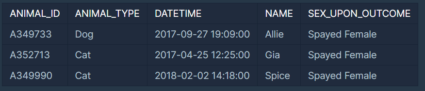 ANIMAL_OUTS 테이블은 동물 보호소에서 입양 보낸 동물의 정보를 담은 테이블입니다. ANIMAL_OUTS 테이블 구조는 다음과 같으며, ANIMAL_ID, ANIMAL_TYPE, DATETIME, NAME, SEX_UPON_OUTCOME는 각각 동물의 아이디, 생물 종, 입양일, 이름, 성별 및 중성화 여부를 나타냅니다. ANIMAL_OUTS 테이블의 ANIMAL_ID는 ANIMAL_INS의 ANIMAL_ID의 외래 키입니다.