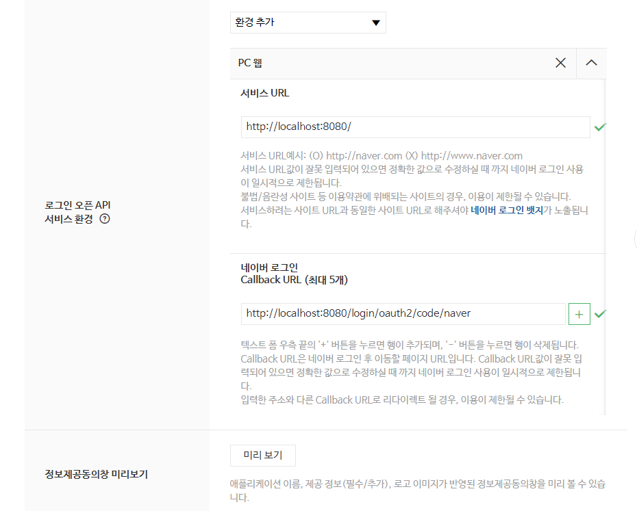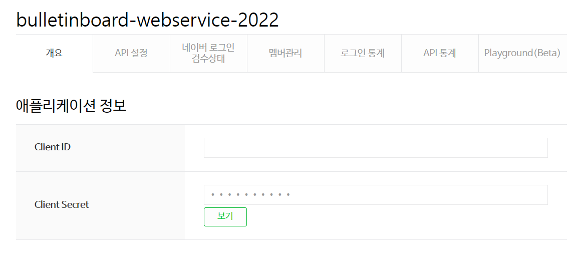📢 아래 정보를 이용하여 클라이언트 ID와 클라이언트 보안 비밀 코드를 프로젝트에 설정