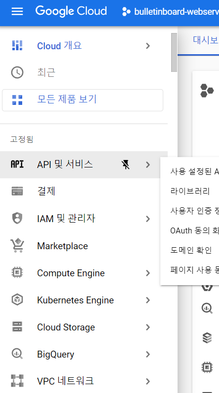 📢 생성이 완료된 프로젝트를 선택하고 왼쪽 메뉴 탭을 클릭해서 API 및 서비스 카테고리로 이동한다.
