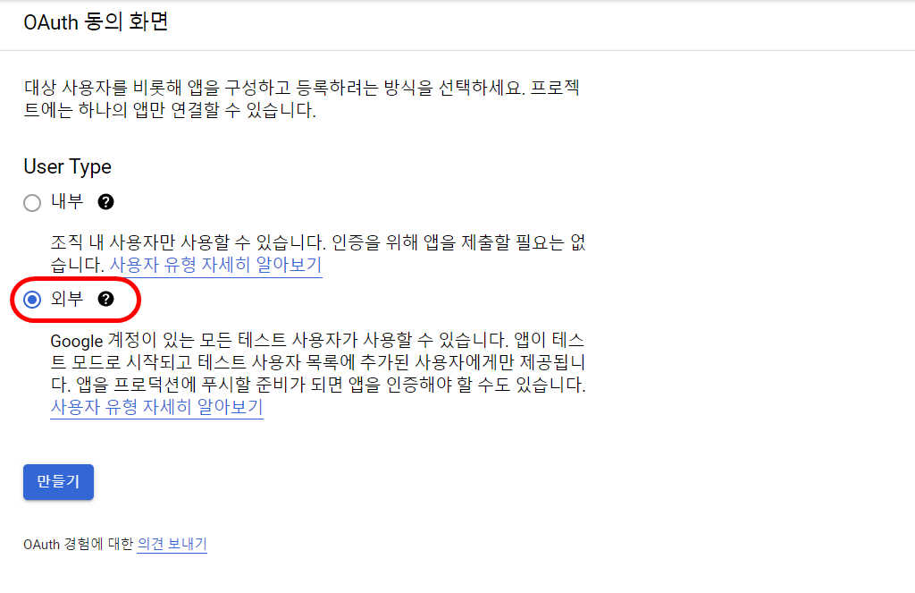 📢 User Type을 선택하는 화면이 나오는데, 여기서 외부로 해야 모든 구글 유저가 사용할 수 있다고 한다.