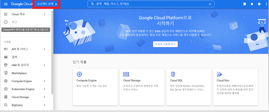 📢 구글 클라우드 플랫폼 주소(https://console.cloud.google.com)로 이동한다. 그리고 다음과 같이 [프로젝트 선택] 탭을 클릭한다.