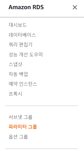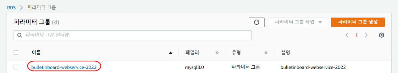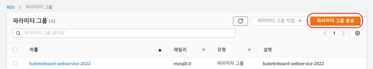 📢 우측 상단 [파라미터 그룹 생성] 클릭