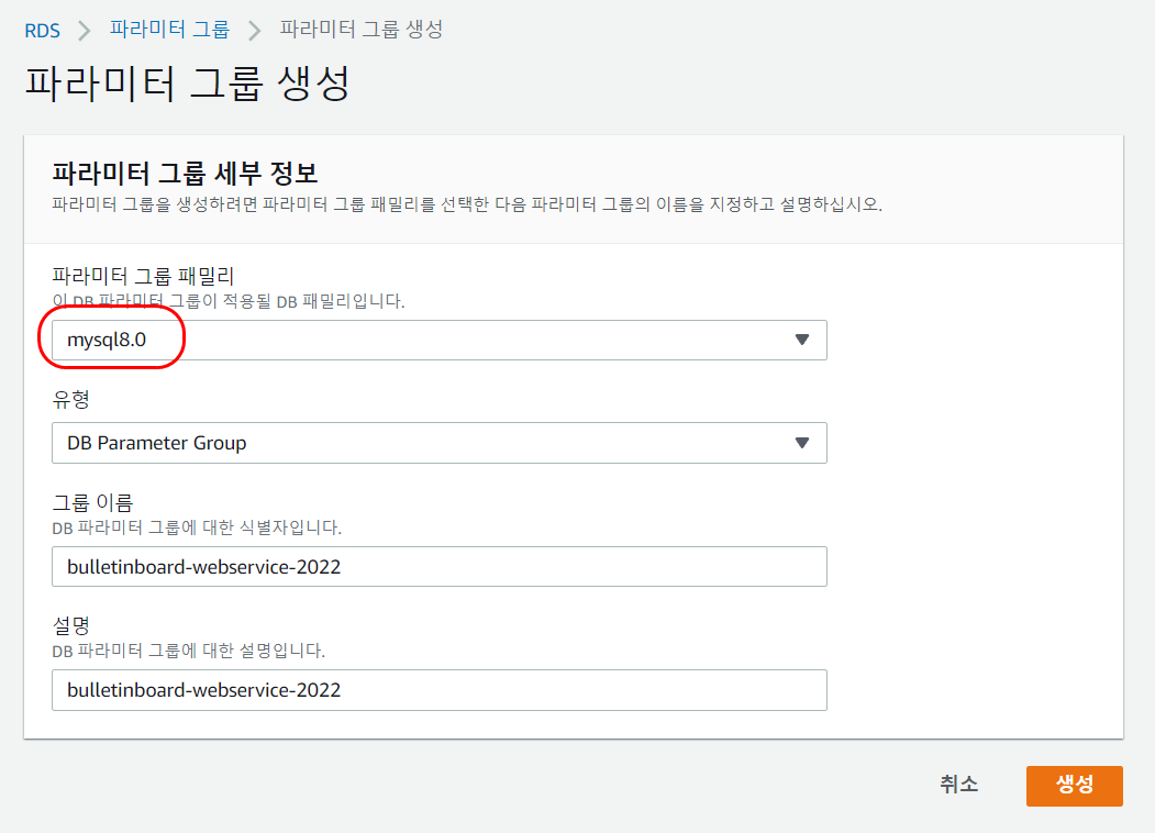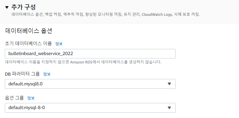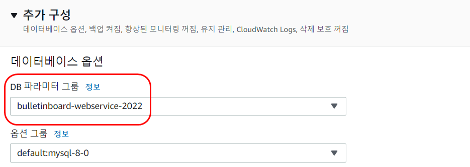 📢 옵션 항목에서 default로 된 DB 파라미터 그룹을 방금 생성한 신규 파라미터 그룹으로 변경