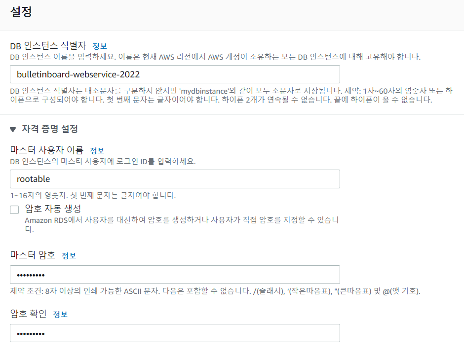 📢 본인만의 DB 인스턴스 이름과 사용자 정보를 등록한다.