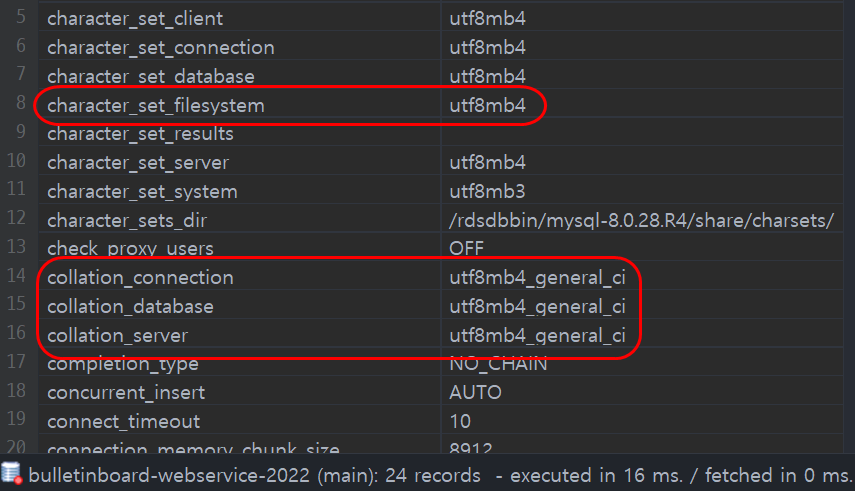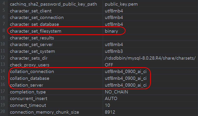 📢 character_set으로 시작하는 항목들은 모두 utf8mb4로 변경하고, collation 항목들은 utf8mb4_general_ci로 변경