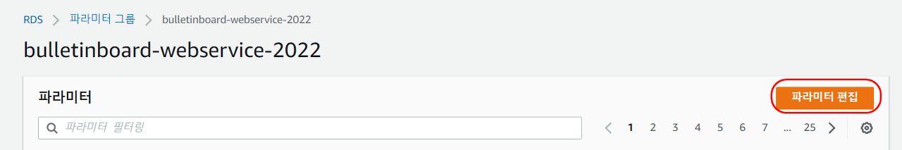 📢 생성한 파라미터 그룹을 선택하여 상세 페이지로 이동 후 [파라미터 편집] 버튼을 클릭하여 편집 모드로 전환