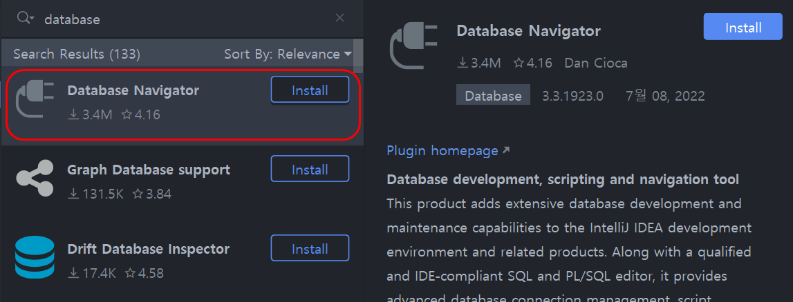 📢 인텔리제이에서 database 플러그인 검색 후 Database Navigator 설치