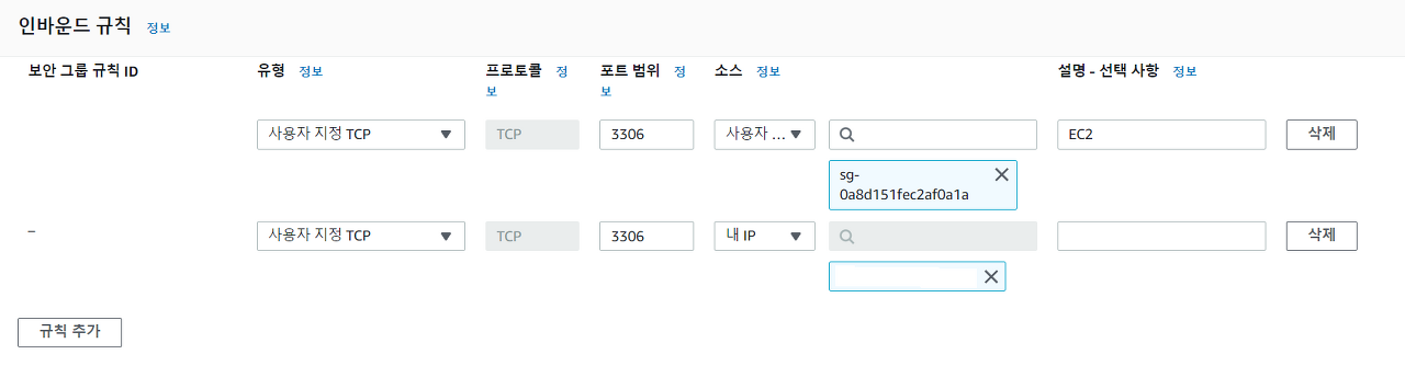 📢 복사된 보안 그룹 ID와 본인의 IP를 RDS 보안 그룹의 인바운드로 추가