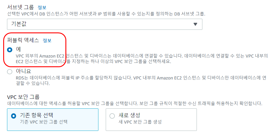 📢 네트워크에선 퍼블릭 액세스를 [예]로 변경하고, 이후 보안 그룹에서 지정된 IP만 접근하도록 막을 예정이다.