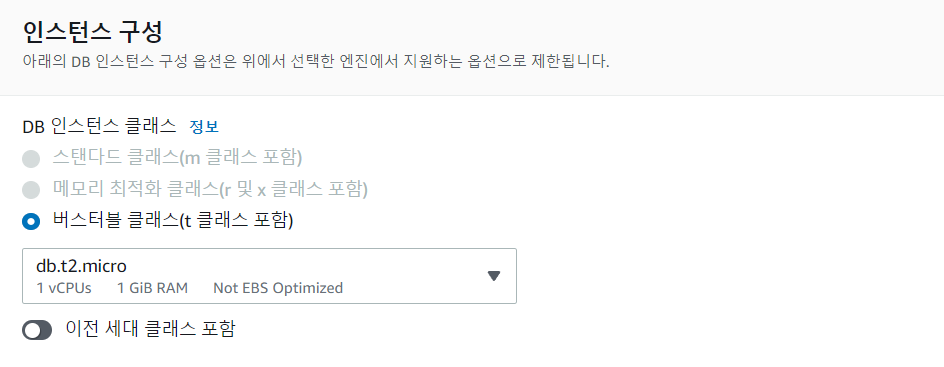 📢 인스턴스 구성에서 DM 인스턴스 클래스를 db.t2.micro로 했다.