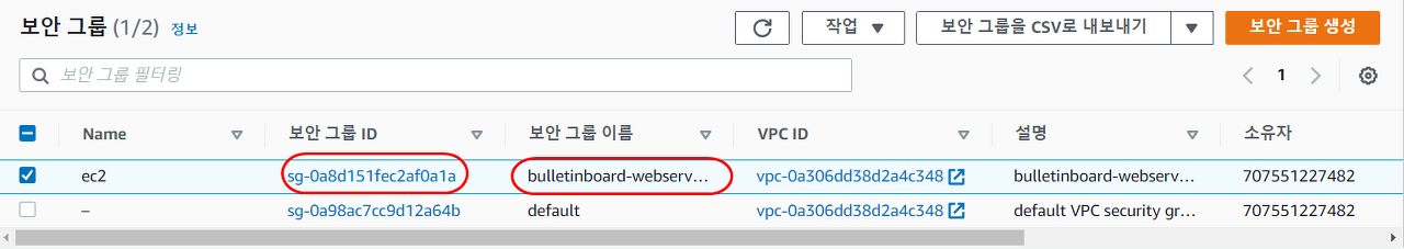 📢 RDS의 보안 그룹 정보를 그대로 두고, 브라우저를 새로 열어 EC2에 사용된 보안 그룹의 그룹 ID를 복사하면 자동으로 RDS의 보안 그룹에 추가된다.