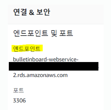 📢 RDS 정보 페이지에서 엔드 포인트를 확인한다. 이 엔트 포인트가 접근 가능한 URL이므로 메모장 같은 곳에 복사해 둔다.