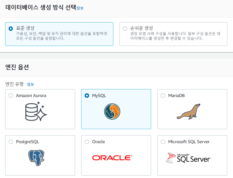 📢 DB 엔진 옵션 선택 화면에서 MySQL 선택