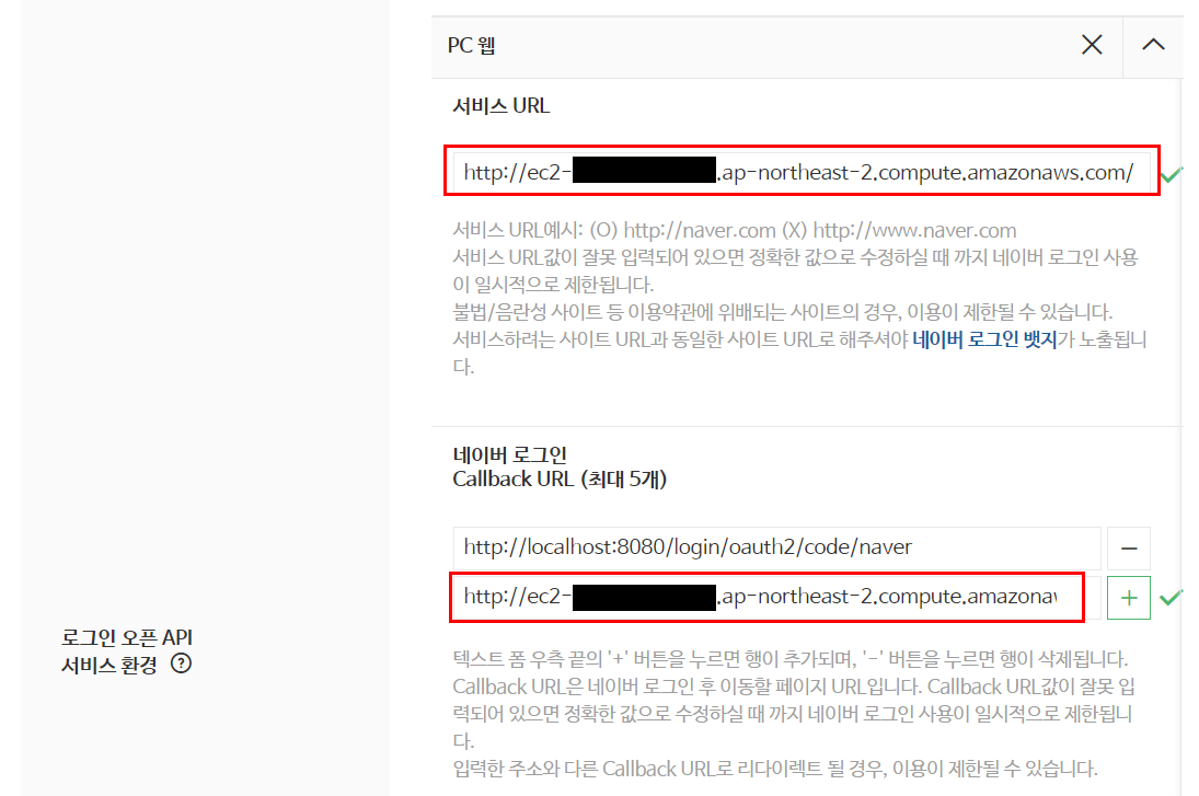 - 전체 주소를 등록한다. (EC2 퍼블릭 DNS:8080/login/oauth2/code/naver)