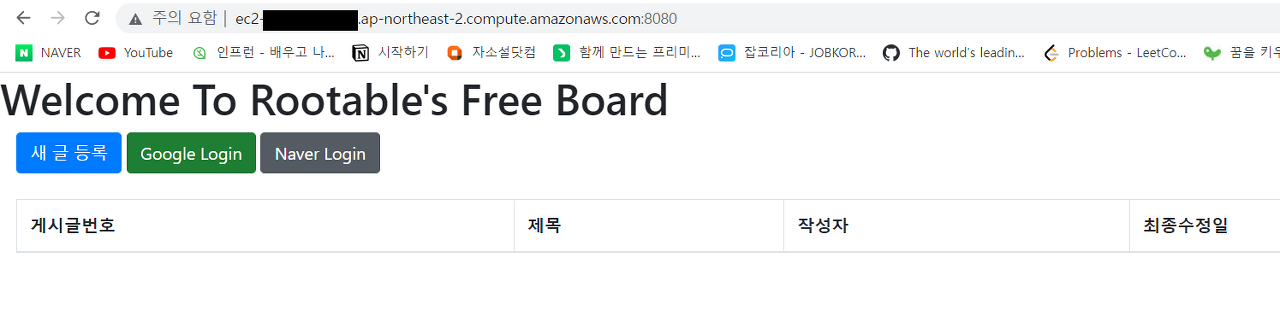 하지만 현재 상태에서는 해당 서비스에 EC2의 도메인을 등록하지 않았기 때문에 구글과 네이버 로그인이 작동하지 않는다. 그래서 차례로 서비스에 등록하도록 한다.
