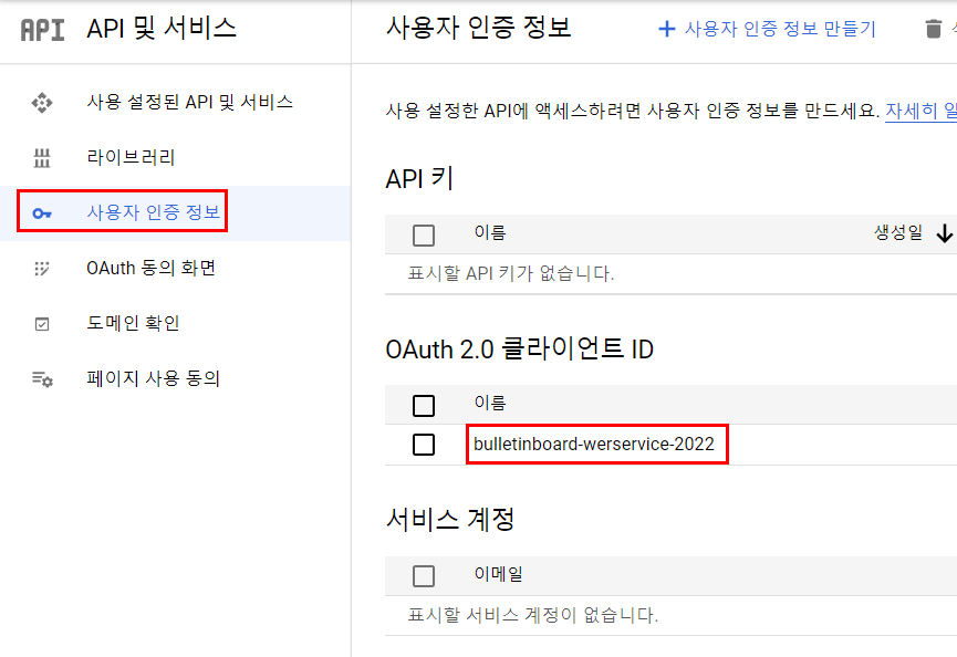 📢 [사용자 인증 정보] 탭을 클릭해서 본인이 등록한 서비스의 이름을 클릭