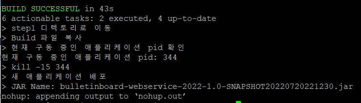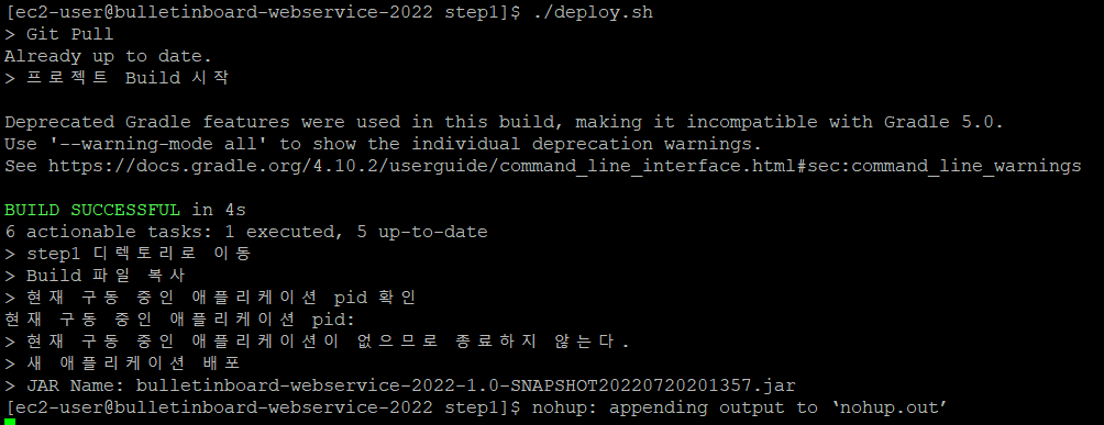 찾은 jar 파일명으로 해당 jar 파일을 nohup으로 실행한다. 스프링 부트의 지원으로 내장 톰캣을 사용해서 jar 파일만 있으면 바로 웹 애플리케이션 서버를 실행할 수 있다. 일반적으로 자바를 실행할 때는 java -jar라는 명령어를 사용하지만, 이렇게 하면 사용자가 터미널 접속을 끊을 때 애플리케이션도 같이 종료된다. 애플리케이션 실행자가 터미널을 종료해도 애플리케이션은 계속 구동될 수 있도록 nohup 명령어를 사용한다.