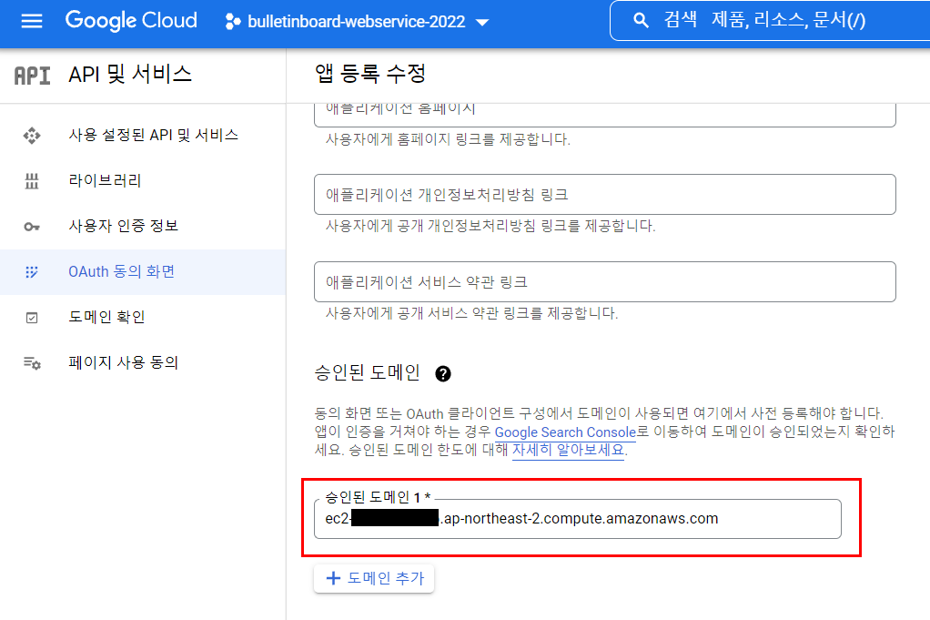 📢 [OAuth 동의 화면] 탭을 선택하고 아래에서 승인된 도메인에 'http://'없이 EC2의 퍼블릭 DNS를 등록