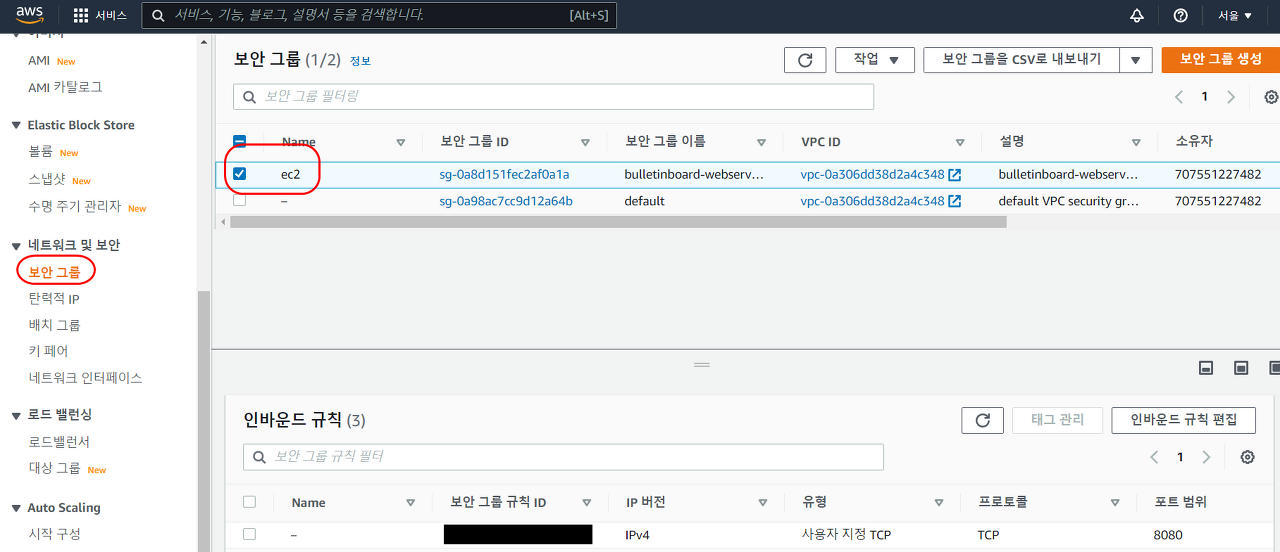 먼저 EC2에 스프링 부트 프로젝트가 8080 포트로 배포되었으니, 8080 포트가 보안 그룹에 열려 있는지 확인한다.