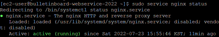 다음 명령어를 통해 nginx의 상태를 보면 잘 실행되었음을 알 수 있다.