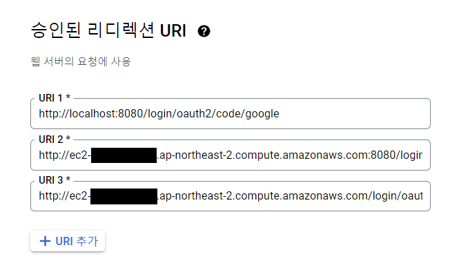 8080이 아닌 80 포트로 주소가 변경되니 구글과 네이버 로그인에도 변경된 주소를 등록해야만 한다. 기존에 등록된 리디렉션 주소에서 8080 부분을 제거하여 추가 등록한다.