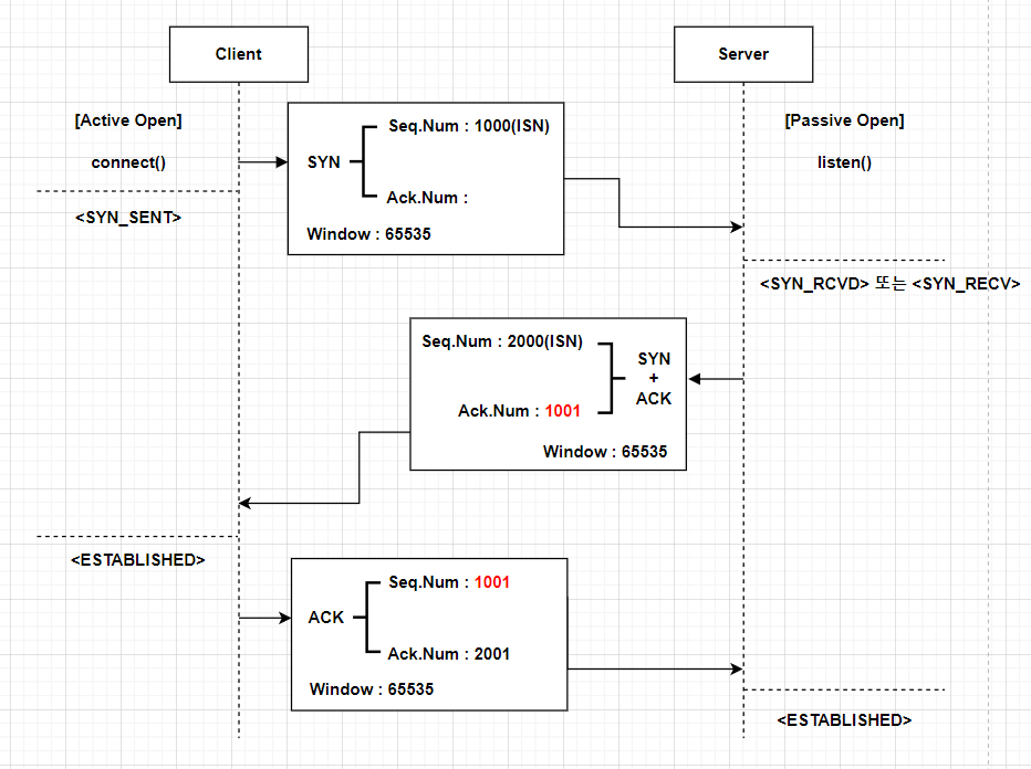 클라이언트는 임의의 랜덤 한 시작 번호인 ISN을 선정하여 데이터를 전송한다. 이때, 세그먼트 내 제어 플래그의 SYN 값만 1로 한다.