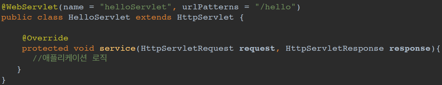 HttpServlet을 상속받아 사용해야 하며, @WebServlet을 통해 서블릿의 이름을 지정하고 어떤 요청 URL 패턴에 응답할지 지정할 수 있다.