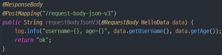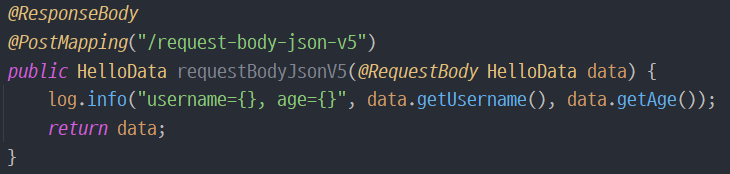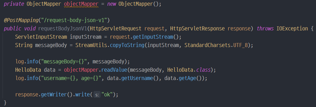 따라서, ObjectMapper 사용 없이 body를 읽어 와서 HelloData라는 객체에 파싱 할 수 있다.