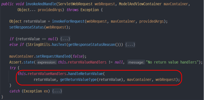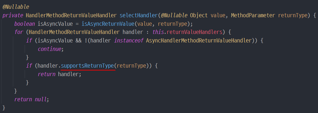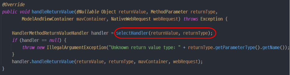 4. try문의 handleReturnValue()가 실행되면서 핸들러를 선택하기 위해 selectHandler() 호출
