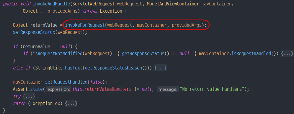 3. 핸들러 어뎁터가 실행되면서 RequestMappingHandlerAdapter에서 invocableMethod.invokeAndHandle() 호출