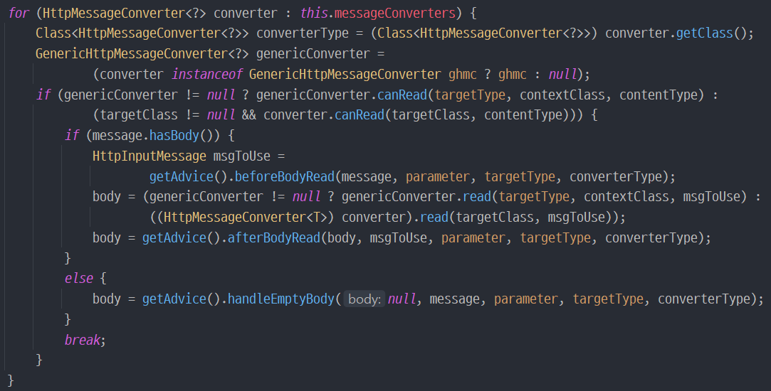6. RequestResponseBodyMethodProcessor의 readWithMessageConverters()를 실행하여 요청 데이터 타입에 맞는 컨버터를 얻어온다.