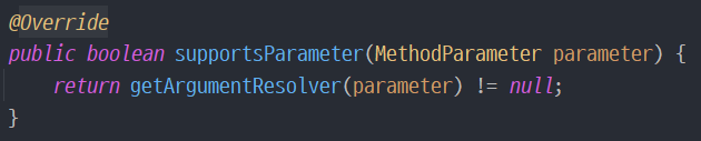 - supportsParameter() 메서드 구현: 어떤 애노테이션을 붙였을 때 또는 어떤 타입일 때 허용할지 결정