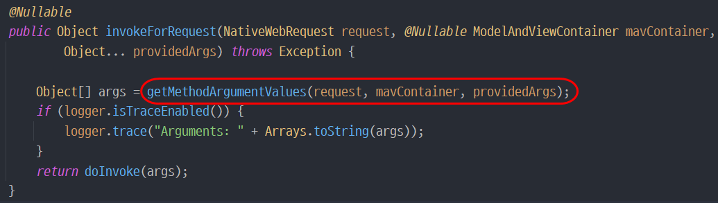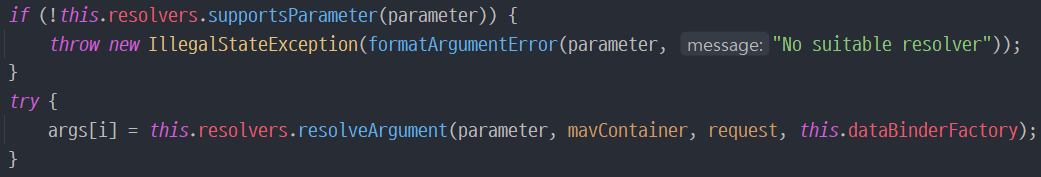 5. invokeAndHandle()에서 invokeForRequest()를 호출하면 getMethodArgumentValues() 메서드가 실행되고, 여기서 supportsParameter()를 통해 해당 파라미터를 처리할 수 있는 resolver를 조회
