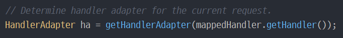 스프링 MVC 구조에서 요청이 들어오면 가장 먼저 Dispatcher Servlet에서 요청과 매핑되는 핸들러를 찾는다. 핸들러를 실행하는 주체는 HandlerAdapter다. 그래서 Dispatcher Servlet은 매핑된 핸들러를 실행해 줄 HandlerAdapter를 목록에서 찾는 것이다.