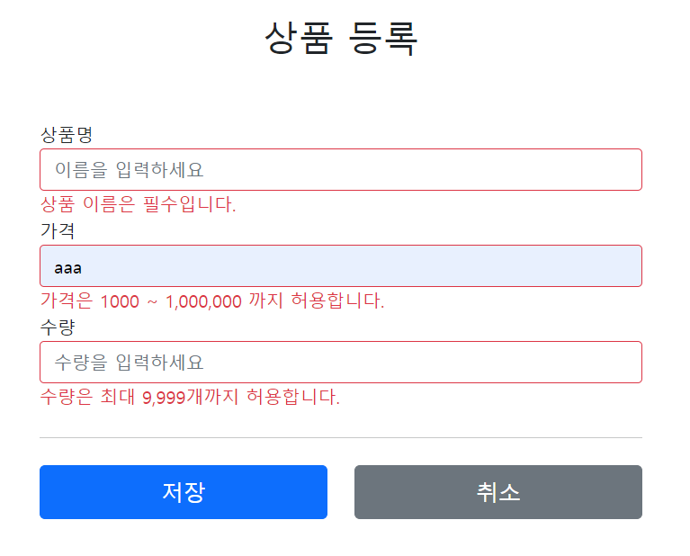 📌 단순한 오류 메시지 vs 자세한 오류 메시지 🔎 단순한 오류 메시지 # 단순한 오류 메시지 required : 필수 값입니다. range : 범위 오류입니다. 범용성이 좋아 여러 곳에서 사용할 수 있다. 메시지