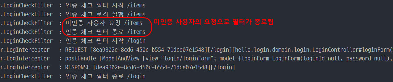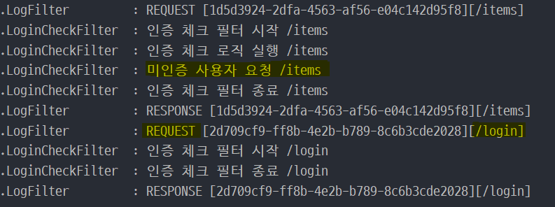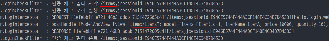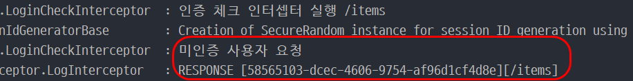 위 결과는 미인증 사용자가 바로 상품 관리 페이지(/items)로 접근했을 때 결과다. 현재 LoginCheckFilter를 통해 인증 체크를 하고 있으며, 인터셉터는 요청 및 응답 로그를 남기는 역할로 세팅했다.