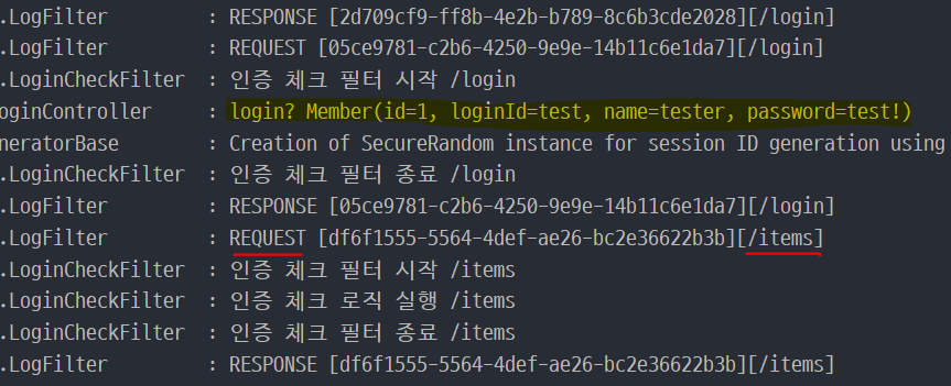 인증을 마친 후 상품 관리 페이지(/items)로 GET 요청이 수행되어 해당 정보가 Filter와 Interceptor에서 확인할 수 있다.
