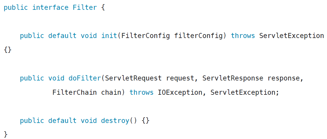 - init() : 필터 초기화 메서드, 서블릿 컨테이너가 생성될 때 호출된다.
